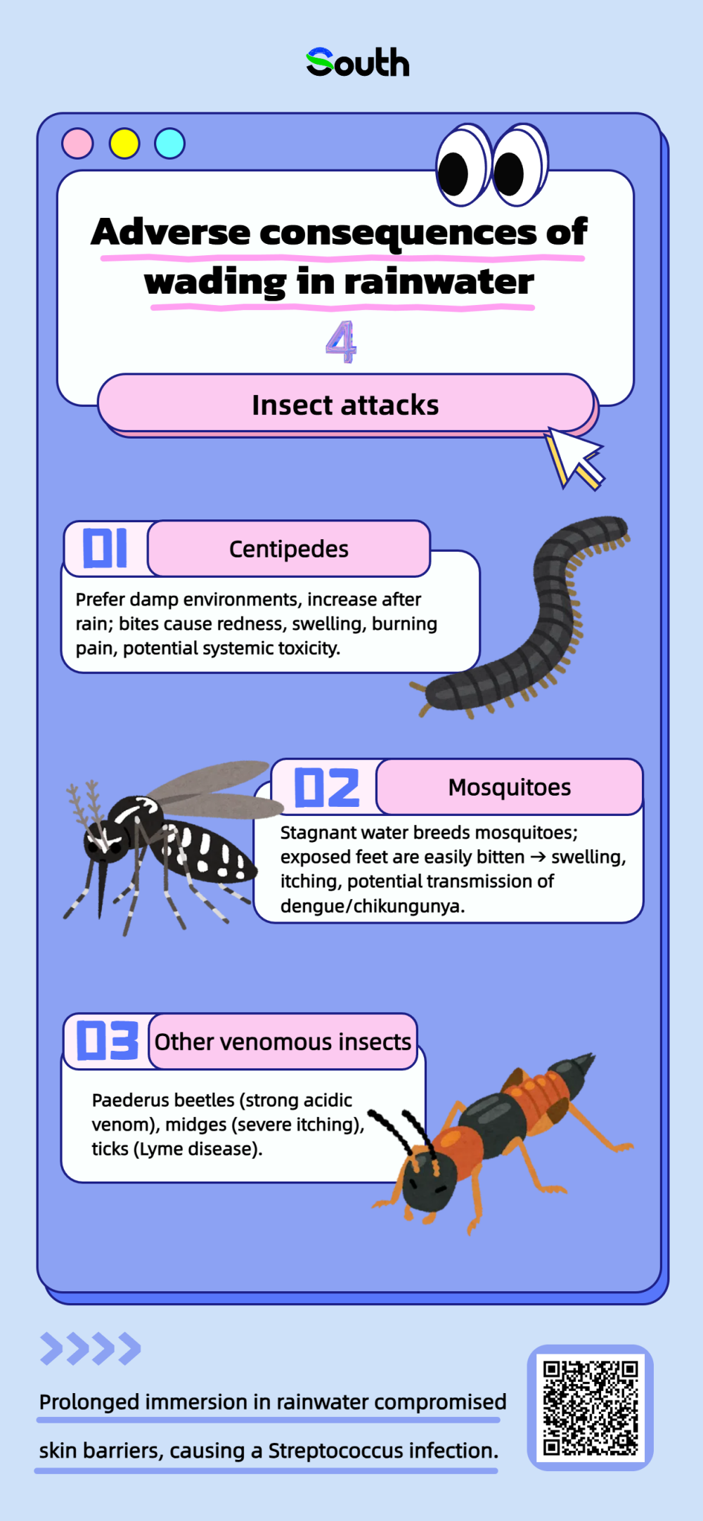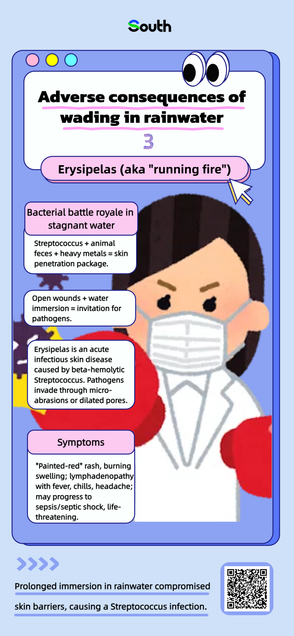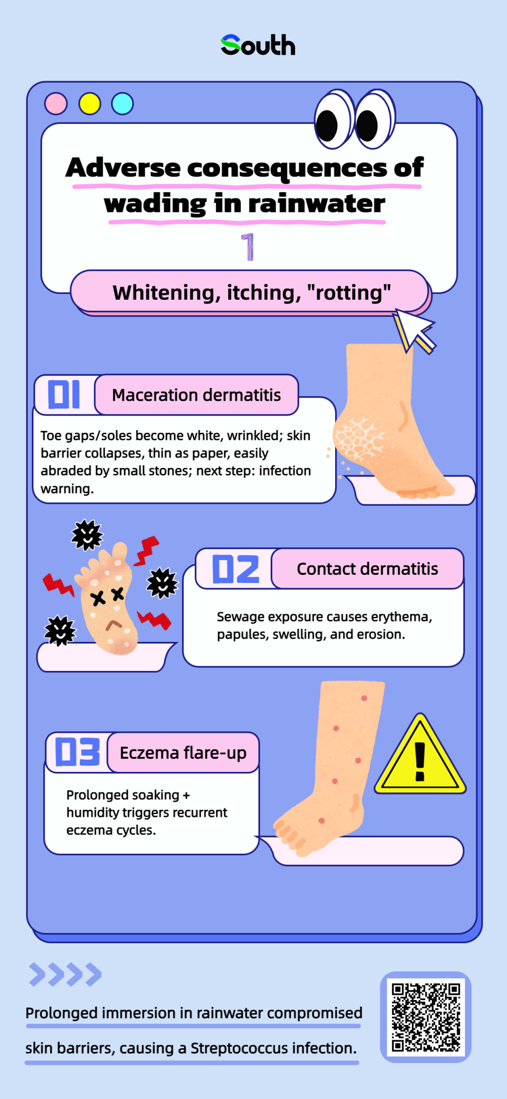 According to the National Emergency Broadcasting, in May this year, a man in Guangzhou encountered a sudden rainstorm and chose to wade through water without changing shoes all day. The next day, he developed a 40℃ fever and a red, swollen, painful left leg, diagnosed with the skin disease erysipelas. Doctors explained that prolonged immersion in rainwater compromised skin barriers, causing a Streptococcus infection, which could lead to sepsis if not treated promptly.