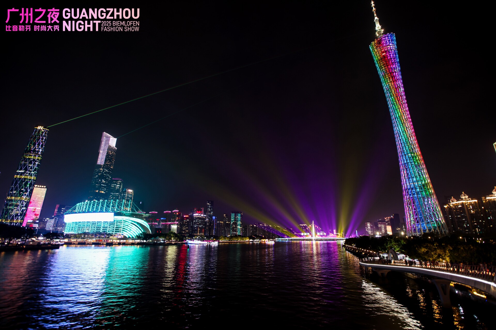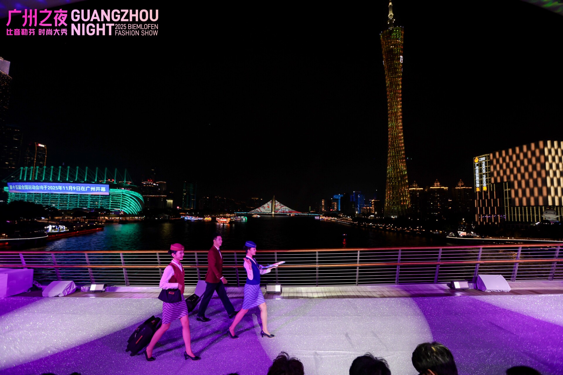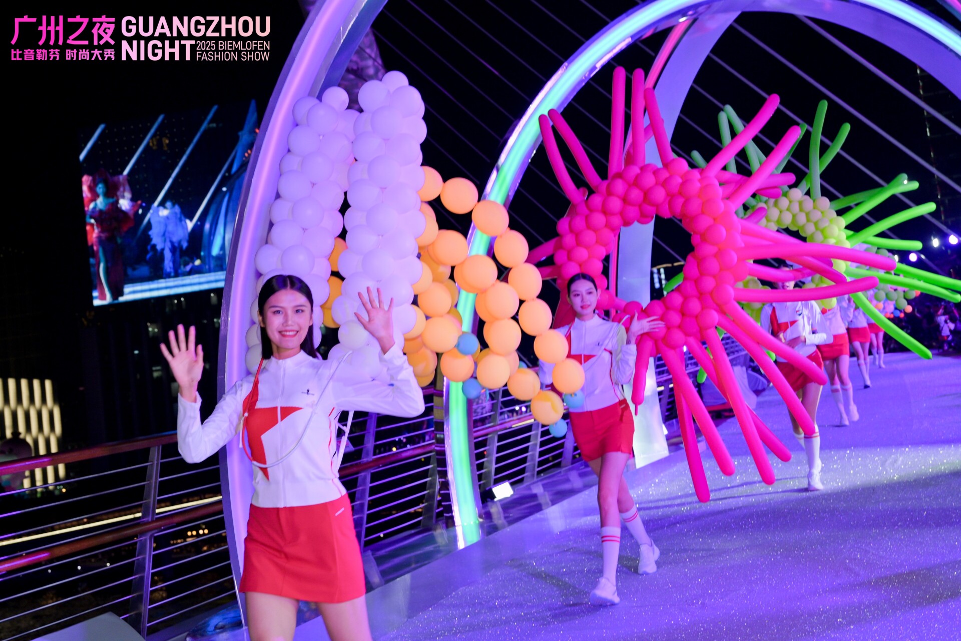 The "Guangzhou Night" 2025 Biemlofen Fashion Show lit up Haixin Bridge on the evening of October 29, marking the 10-day countdown to China's 15th National Games.