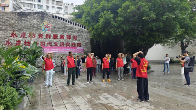 活動現(xiàn)場,紅棉老兵代表彪叔分享了參與志愿服務(wù)的經(jīng)歷與體會,并圍繞大型賽事服務(wù)注意事項進行講解。彪叔表示,作為紅棉老兵,要充分發(fā)揮退役軍人“五種力量”,在十五運會和殘?zhí)貖W會期間爭當表率、展現(xiàn)擔當。在健身環(huán)節(jié),持有國家職業(yè)健身教練資質(zhì)的紅棉老兵譚教練帶領(lǐng)居民開展科學(xué)拉伸訓(xùn)練,通過運動防護知識示范講解和“一對一”動作糾正,傳遞“從練兵場到健身場,使命同樣光榮”的健康理念。隨后開展的“榮耀永慶”健身行活動中,紅棉老兵與居民組成“榮耀方陣”,沿永慶坊青石板路有序行進,途經(jīng)麻石巷、騎樓街等特色街區(qū),在領(lǐng)略嶺南建筑風貌中深化軍民情誼,傳遞健康生活理念。