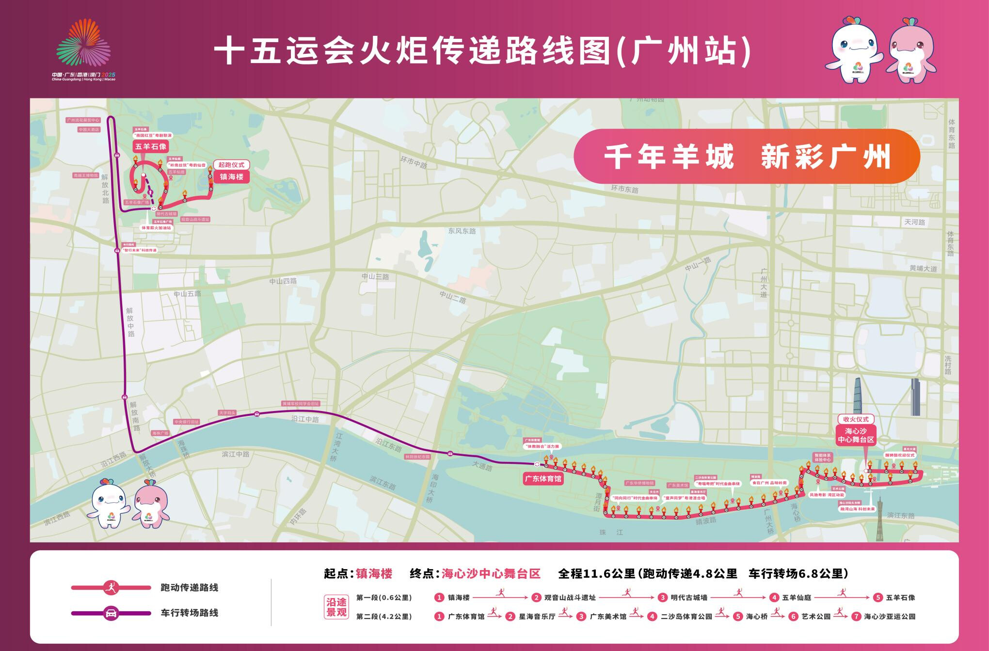 廣州站十五運(yùn)會(huì)廣州賽區(qū)火炬?zhèn)鬟f路線以“千年羊城 新彩廣州”為主題,從傳統(tǒng)中軸邁向新中軸,從城市起源圖騰(五羊石像)到近代歷史印記(海珠廣場(chǎng)),從體育冠軍搖籃(廣東省二沙體育訓(xùn)練中心)到城市客廳(海心沙中心舞臺(tái)),串聯(lián)歷史地標(biāo)與現(xiàn)代風(fēng)貌,展開(kāi)一段從古代文明到近代革命、再到現(xiàn)代都市的歷史敘事,展現(xiàn)“老城市新活力”的傳承與創(chuàng)新,彰顯廣州在融灣向海的中國(guó)式現(xiàn)代化進(jìn)程中排頭兵、領(lǐng)頭羊和火車頭的使命擔(dān)當(dāng)。
