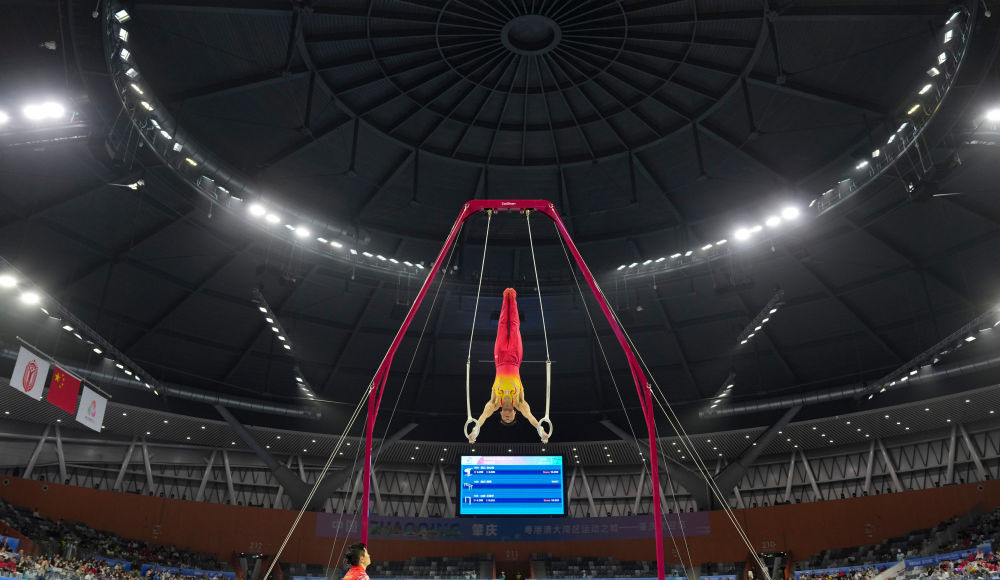 11月12日,江蘇隊選手孫煒在吊環(huán)比賽中。新華社記者 胥冰潔 攝