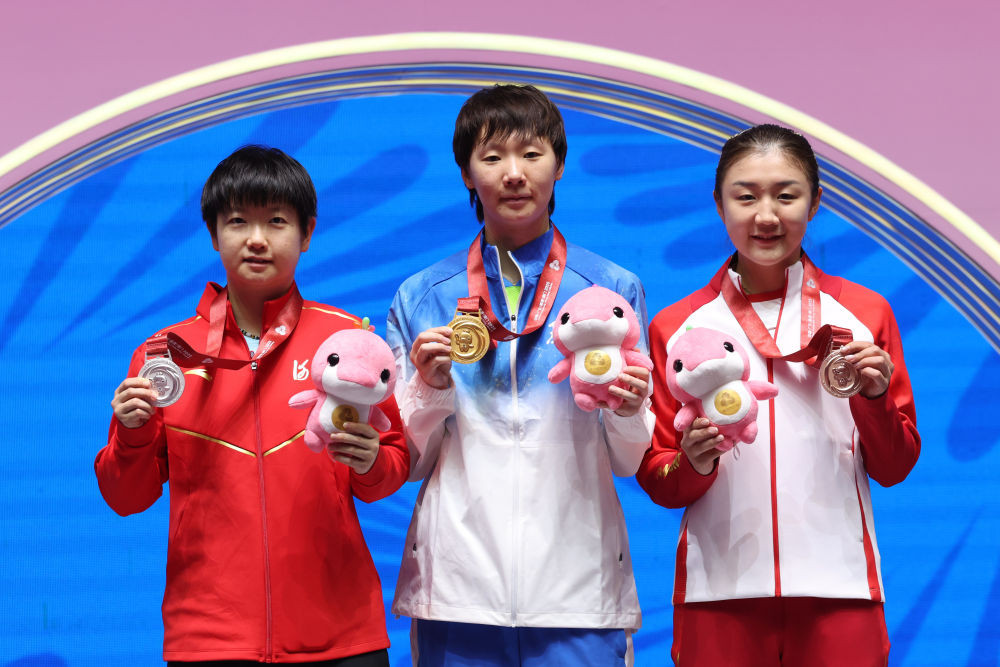 11月16日,冠軍黑龍江隊(duì)選手王曼昱(中)、亞軍河北隊(duì)選手孫穎莎(左)和季軍山東隊(duì)選手陳夢(mèng)在頒獎(jiǎng)儀式上合影。新華社記者 梁旭 攝