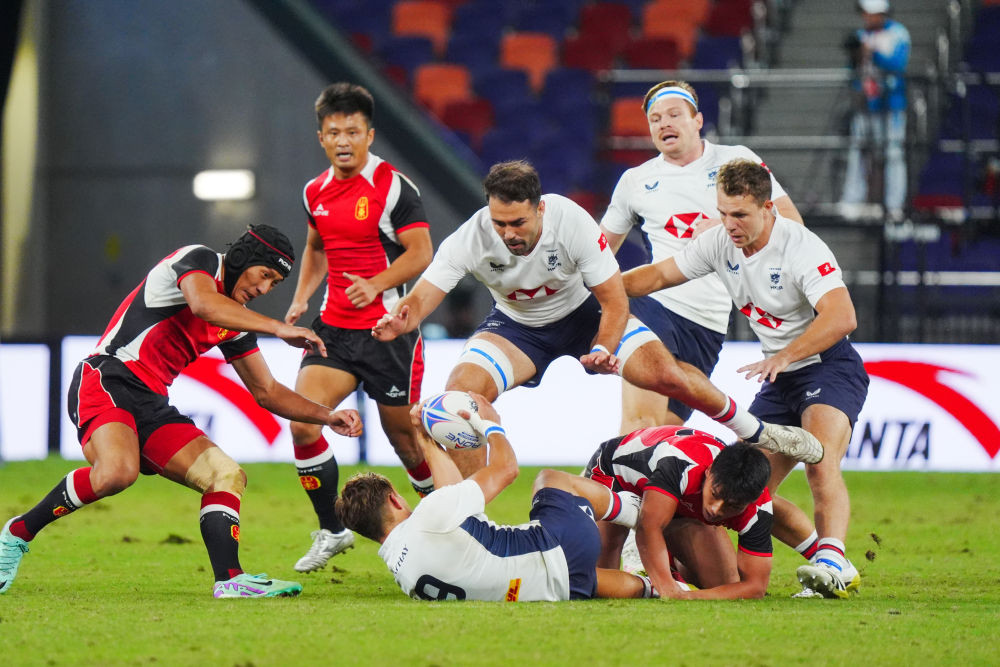 11月14日,雙方球員在比賽中拼搶。當(dāng)日,在香港舉行的第十五屆全國運動會七人制橄欖球男子金牌賽中,香港隊26比19戰(zhàn)勝山東隊,奪得冠軍。新華社記者 朱煒 攝