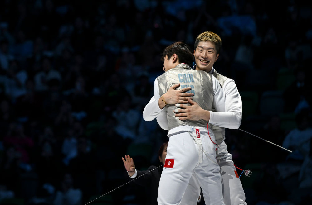 11月19日,香港隊選手蔡俊彥(左)和隊友張家朗在比賽后相擁慶祝奪冠。新華社記者 胡虎虎 攝
