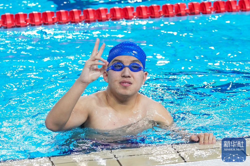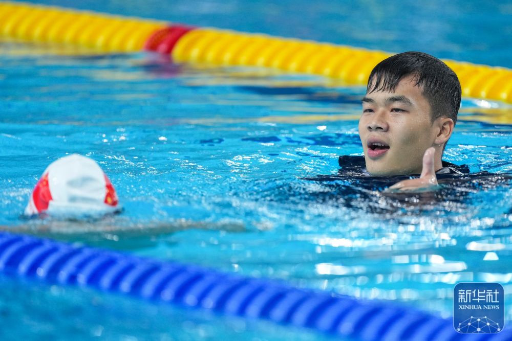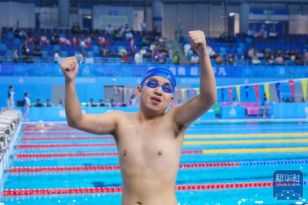 ↑黑龍江隊(duì)選手楊寶龍?jiān)谀凶?6-21歲組50米仰泳預(yù)賽后慶祝。新華社記者 伍志尊 攝