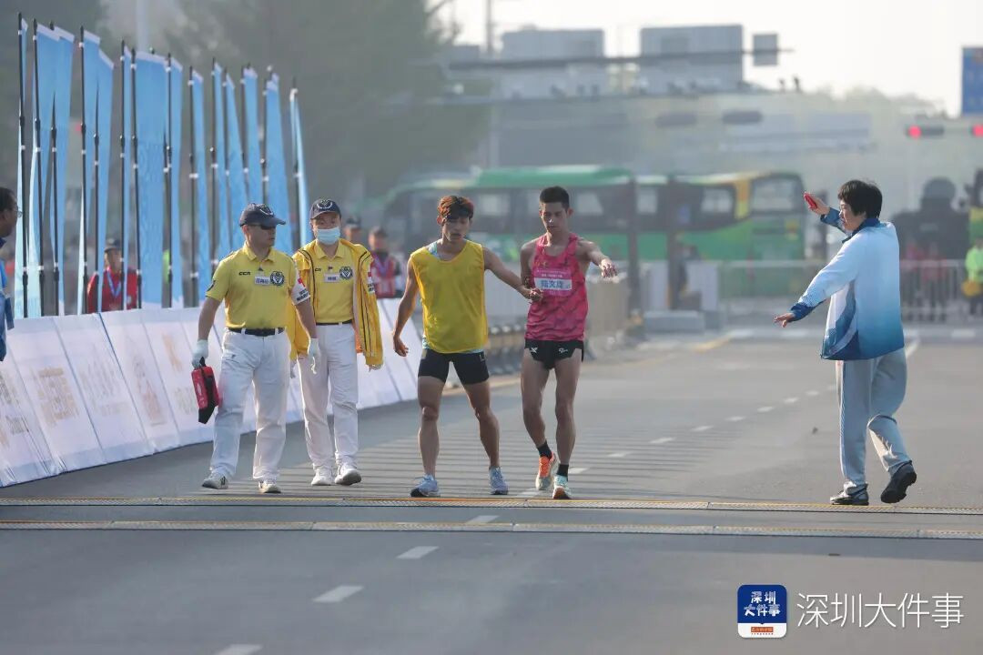 被勸阻后,兩人改為手挽手,以緩慢卻堅定的步伐共同走向終點。