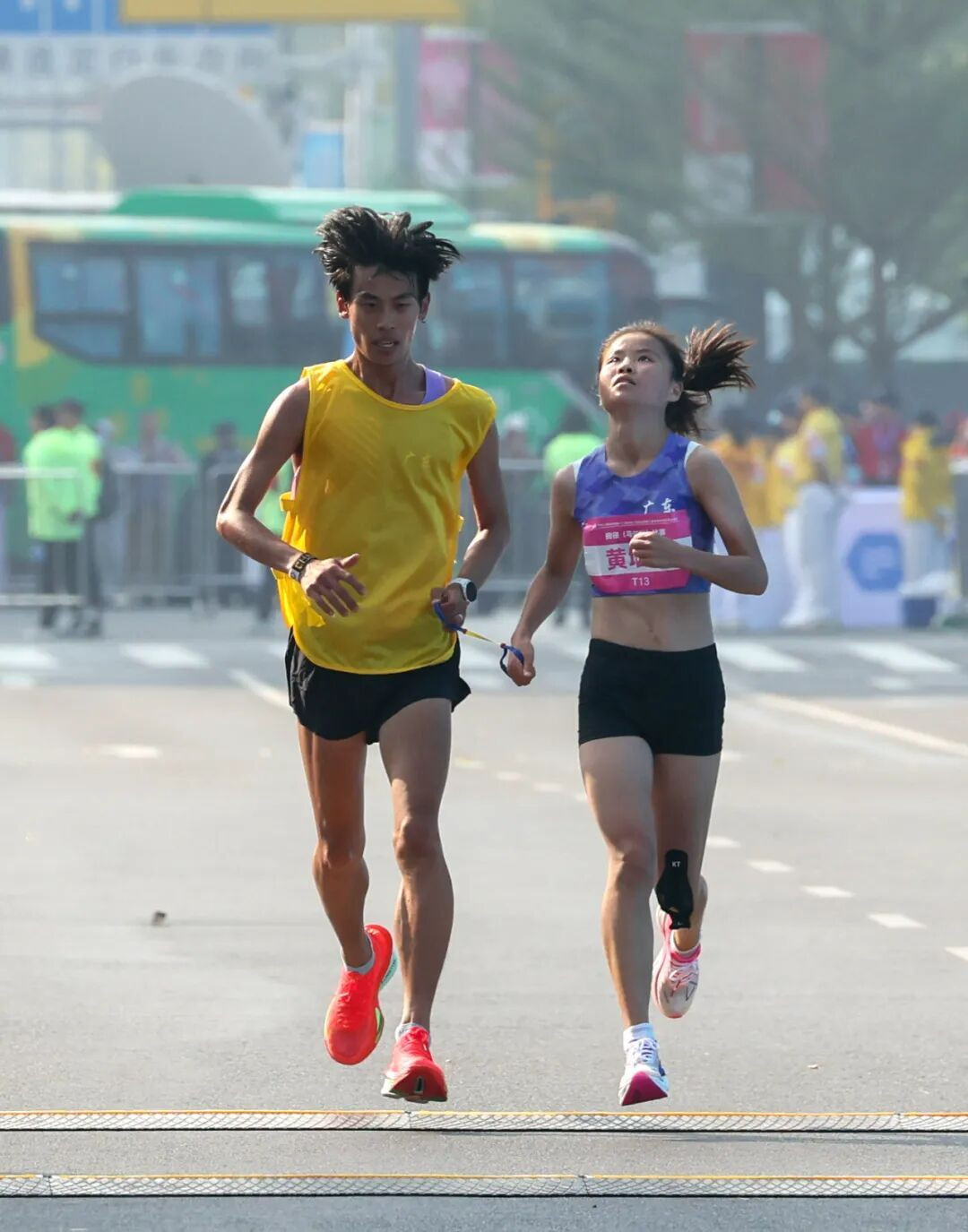 醫(yī)療人員趕到時,易佳雄擺手拒絕,重新系緊牽引繩后,兩人相互攙扶著繼續(xù)奔跑。