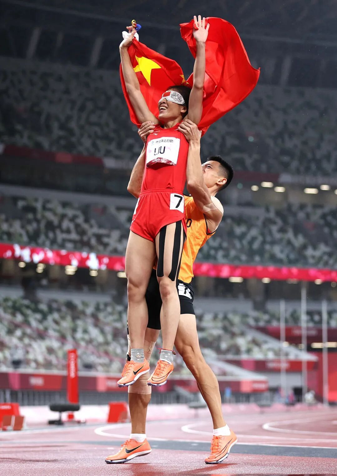 賽后,她高高舉起國旗,領(lǐng)跑員徐冬林則將她穩(wěn)穩(wěn)托舉過頭頂。