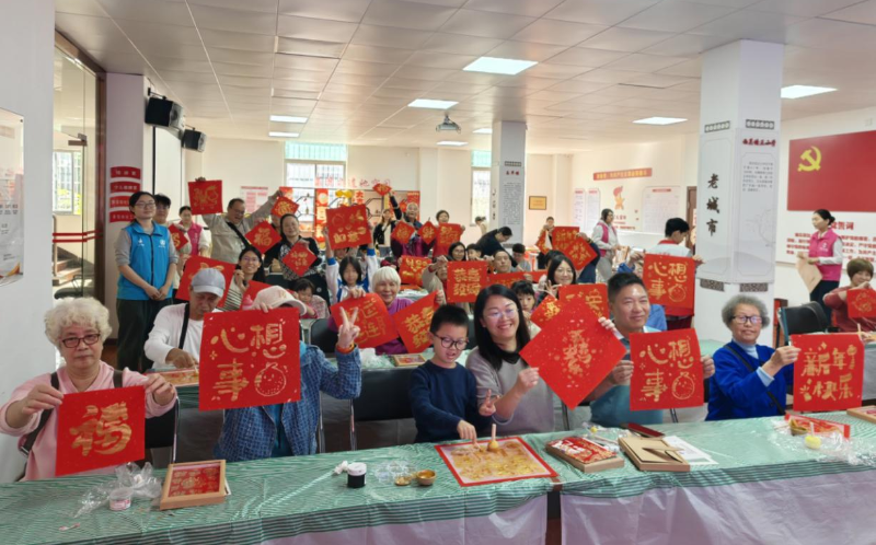 新春佳節(jié)離不開傳統(tǒng)文化的深厚滋養(yǎng)。街道多個(gè)社區(qū)組織黨員志愿者和書法愛好者現(xiàn)場揮毫,書寫蘊(yùn)含吉祥寓意的春聯(lián)和“?!弊郑赓M(fèi)贈送居民,并組建慰問小隊(duì)將手寫的祝福精準(zhǔn)送達(dá)高齡、獨(dú)居老人及困難家庭。此外,非遺技藝巧妙融入:叢桂社區(qū)開展“福”字拓印體驗(yàn),黨員們親手操作感受傳統(tǒng)工藝魅力;永慶坊社區(qū)以非遺金箔畫創(chuàng)作“福”字、生肖馬等主題作品,贈予獨(dú)居老黨員和困難家庭;誼園社區(qū)則將非遺春聯(lián)拓印與“萬福桶”手工拼裝結(jié)合,在小組協(xié)作中傳遞匠心祝福。