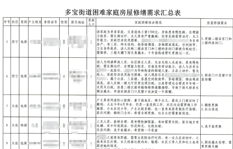 對(duì)此,多寶街道迅速行動(dòng),由掛點(diǎn)街領(lǐng)導(dǎo)帶隊(duì),組織社區(qū)居委會(huì)、網(wǎng)格員、社工等力量,對(duì)全街65戶困難家庭開(kāi)展全覆蓋入戶摸排,建立“一戶一冊(cè)”動(dòng)態(tài)臺(tái)賬,精準(zhǔn)識(shí)別52項(xiàng)具體修繕需求,將群眾的“問(wèn)題清單”轉(zhuǎn)化為街道的“責(zé)任清單”。