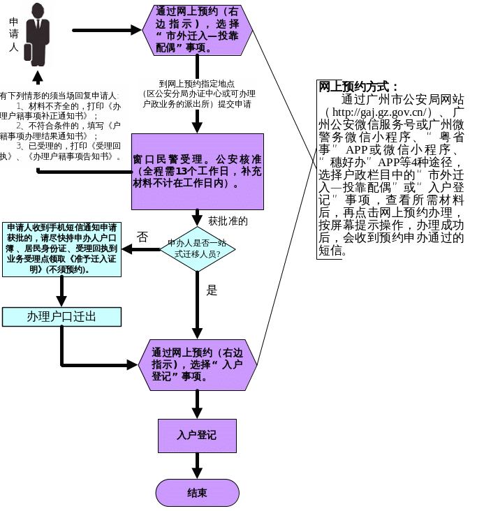 (一)符合申辦條件的人員可以通過預(yù)約現(xiàn)場辦理或網(wǎng)上辦理(通過①廣州市公安局網(wǎng)站http://gaj.gz.gov.cn/;②廣州公安微信服務(wù)號或廣州微警務(wù)微信小程序;③“粵省事”APP或微信小程序;④“穗好辦”APP,選擇戶政欄目中的“市外遷入—投靠配偶”事項)。通過網(wǎng)上預(yù)約,可選擇本市公安機關(guān)任一可辦理戶政業(yè)務(wù)的辦理點提交申請。入戶時持《受理回執(zhí)》、遷入地的家庭戶居民戶口簿(戶口一站式遷移的還需提供遷出地的居民戶口簿,非一站式遷移的則提供《準(zhǔn)予遷入證明》(第三聯(lián))、《戶口遷移證》),通過網(wǎng)上預(yù)約(操作同上,選擇“入戶登記”事項),可選擇本市公安機關(guān)任一可辦理戶政業(yè)務(wù)的辦理點辦理入戶登記。