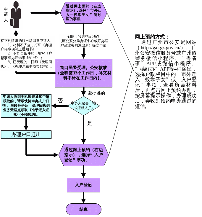 1.符合申辦條件的人員可以通過預約現(xiàn)場辦理或網(wǎng)上辦理(通過①廣州公安局網(wǎng)站http://gaj.gz.gov.cn/;②廣州公安微信服務(wù)號或廣州微警務(wù)微信小程序;③“粵省事”APP或微信小程序;④“穗好辦”APP,選擇戶政欄目中的“市外遷入—投靠父母”所對應的事項)。現(xiàn)場辦理通過網(wǎng)上預約,可選擇本市公安機關(guān)任一可辦理戶政業(yè)務(wù)的辦理點提交申請。入戶時持《受理回執(zhí)》、遷入地的家庭戶居民戶口簿(戶口一站式遷移的還需提供遷出地的居民戶口簿,非一站式遷移的則提供《準予遷入證明(第三聯(lián))》《戶口遷移證》),通過網(wǎng)上預約(操作同上,選擇“入戶登記”事項),可選擇本市公安機關(guān)任一可辦理戶政業(yè)務(wù)的辦理點辦理入戶登記。