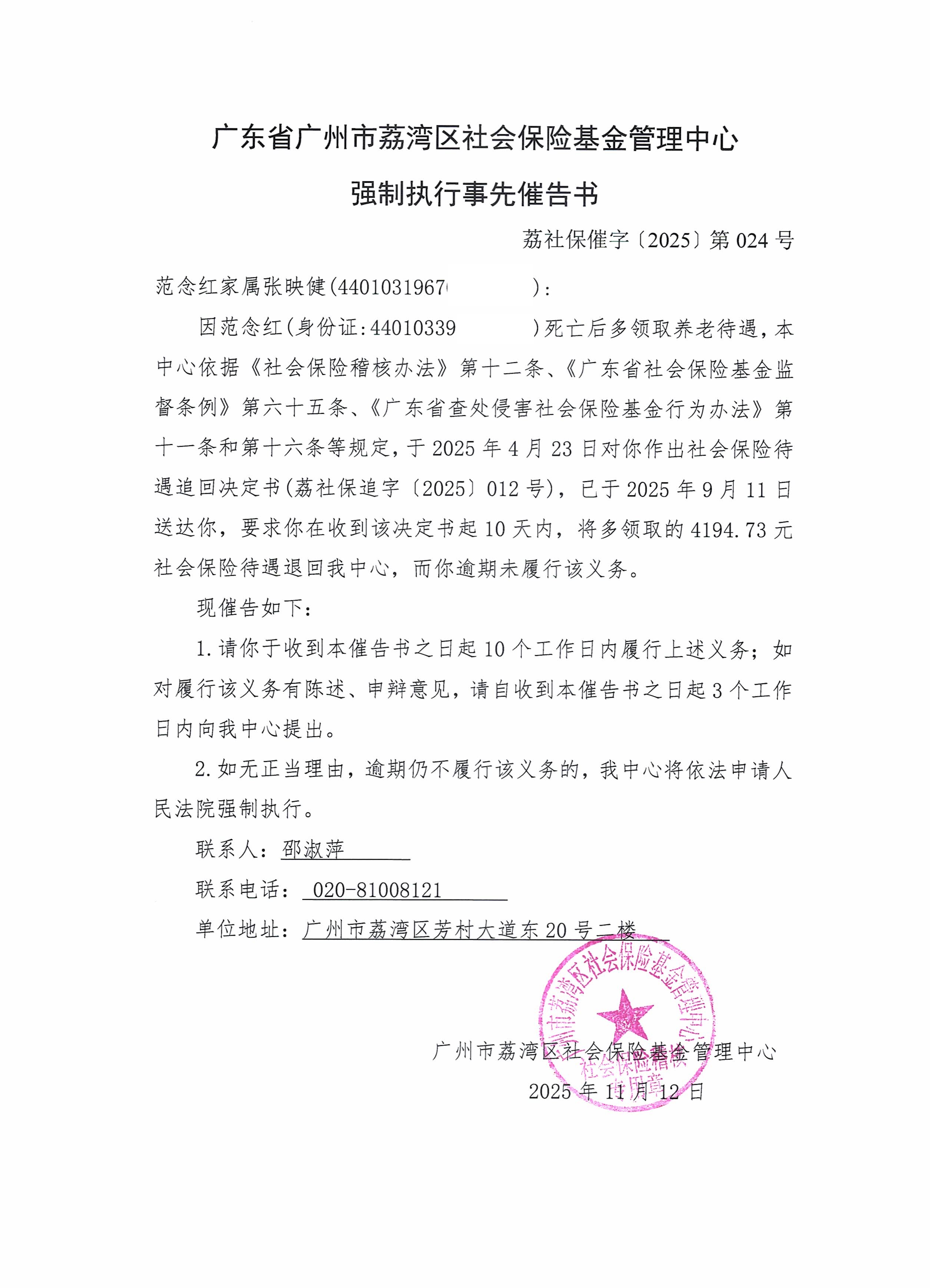 經(jīng)查,范念紅(44010339*******)在死亡后多領(lǐng)取城鎮(zhèn)職工養(yǎng)老保險(xiǎn)待遇,本中心依據(jù)《社會(huì)保險(xiǎn)稽核辦法》第十二條、《廣東省社會(huì)保險(xiǎn)基金監(jiān)督條例》第六十五條、《廣東省查處侵害社會(huì)保險(xiǎn)基金行為辦法》第十一條和第十六條等規(guī)定,于2025年4月23日對(duì)你作出社會(huì)保險(xiǎn)待遇追回決定書(荔社保追字(2025)012號(hào)),已于2025年9月11日送達(dá)你,要求你在收到該決定書起10天內(nèi),將多領(lǐng)取的4194.73元社會(huì)保險(xiǎn)待遇退回我中心。因你逾期未履行該義務(wù),現(xiàn)我中心向你發(fā)出《強(qiáng)制執(zhí)行事先催告書》(荔社保催字〔2025〕第024號(hào))。由于無法與你取得聯(lián)系,現(xiàn)公告送達(dá)《強(qiáng)制執(zhí)行事先催告書》(荔社保催字〔2025〕第024號(hào))。本公告自發(fā)布之日起經(jīng)過30日,視為送達(dá)。