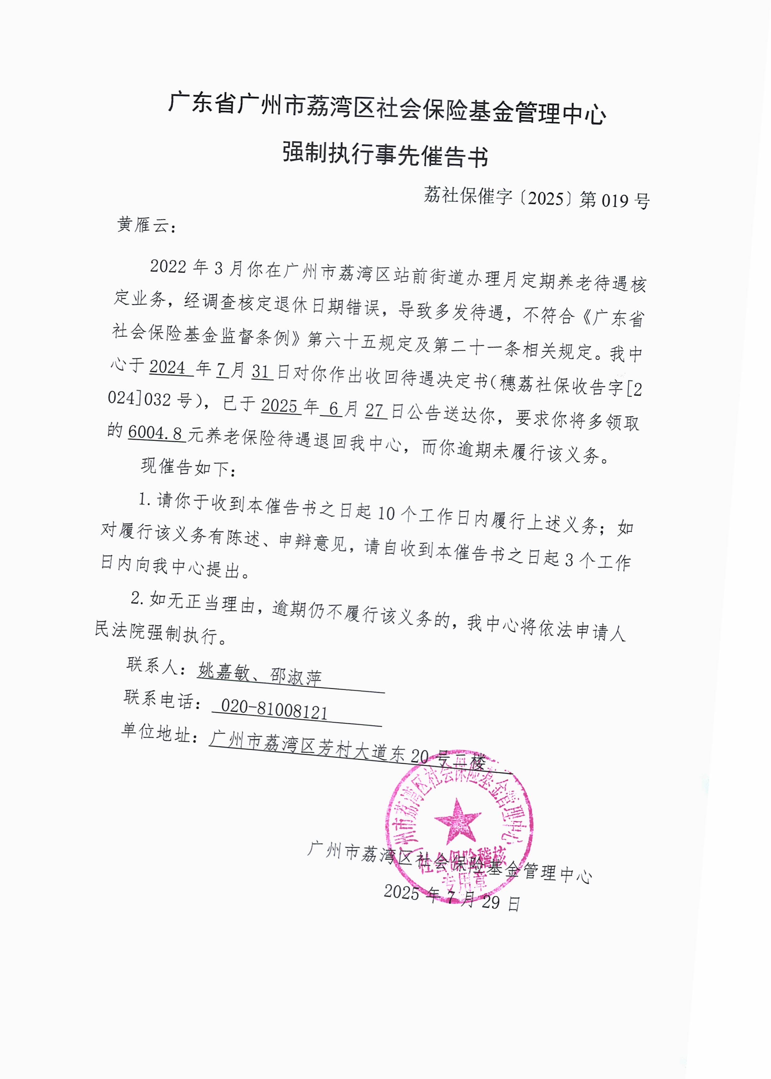 經(jīng)查,你(4407221972********)因核定退休日期錯誤,多領(lǐng)取城鎮(zhèn)職工養(yǎng)老保險待遇,本中心依據(jù)《社會保險稽核辦法》第十二條、《廣東省社會保險基金監(jiān)督條例》第六十五條、《廣東省查處侵害社會保險基金行為辦法》第十一條和第十六條等規(guī)定,于2024年7月31日對你作出收回待遇決定書(穗荔社保收告字[2024]032號),已于2025年6月27日公告送達你,要求你將多領(lǐng)取的6004.8元養(yǎng)老保險待遇退回我中心,而你逾期未履行該義務(wù)。現(xiàn)我中心向你發(fā)出《強制執(zhí)行事先催告書》(荔社保催字〔2025〕第019號)。由于無法與你取得聯(lián)系,現(xiàn)公告送達《強制執(zhí)行事先催告書》(荔社保催字〔2025〕第019號)。本公告自發(fā)布之日起經(jīng)過30日,視為送達。