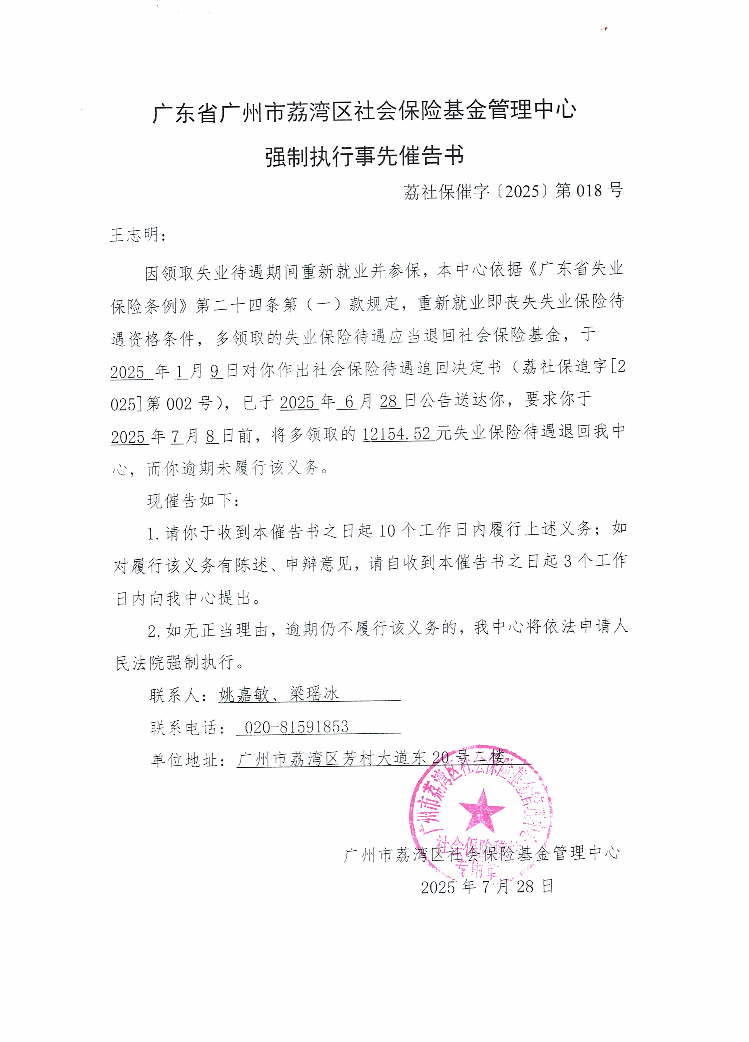 附件:《強(qiáng)制執(zhí)行事先催告書》(荔社保催字〔2025〕第018號(hào)).jpg